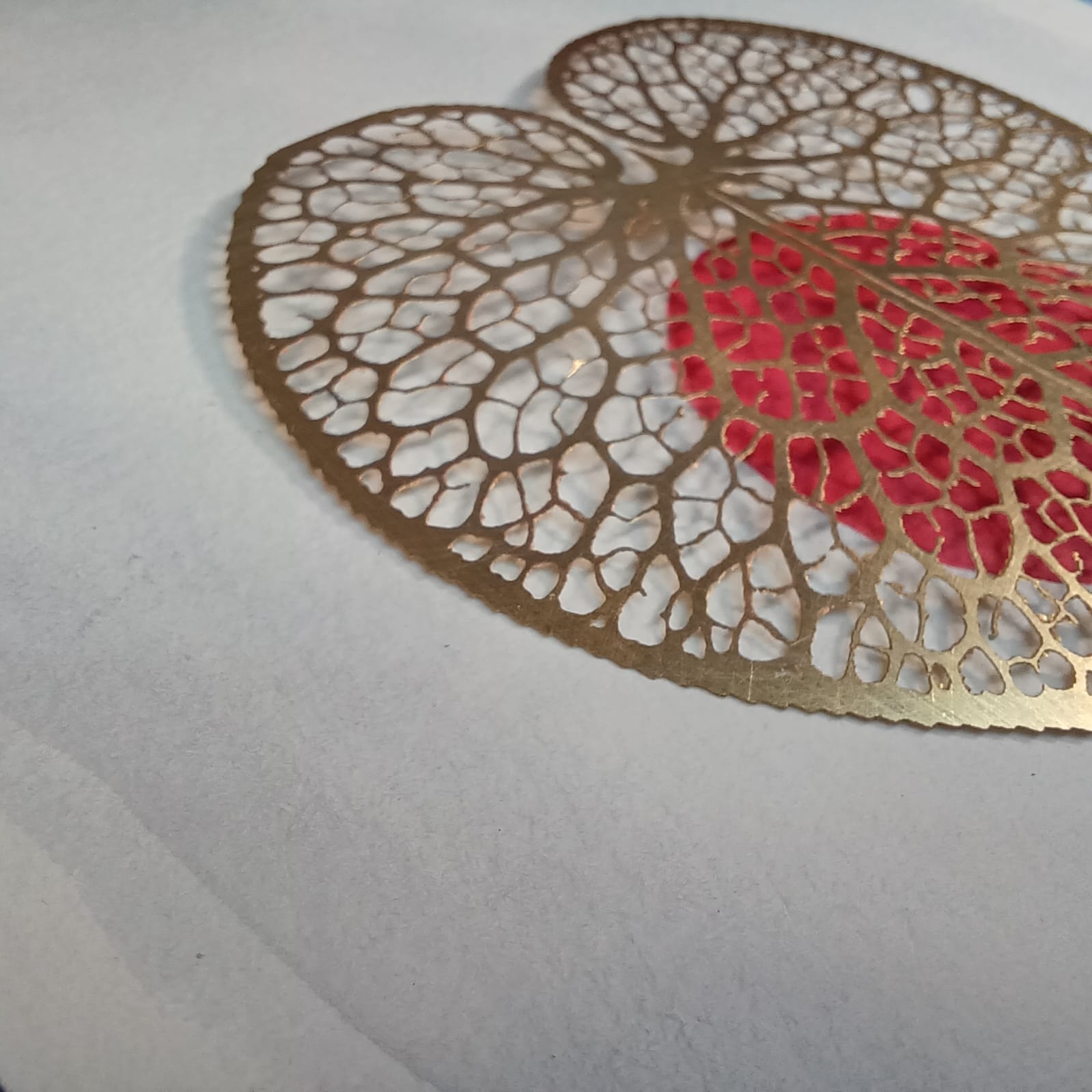 Engraved brass sheet 0.1mm brass etched foil applied to 200gsm 100% cotton paper (18×12cm), with Talens watercolour.
