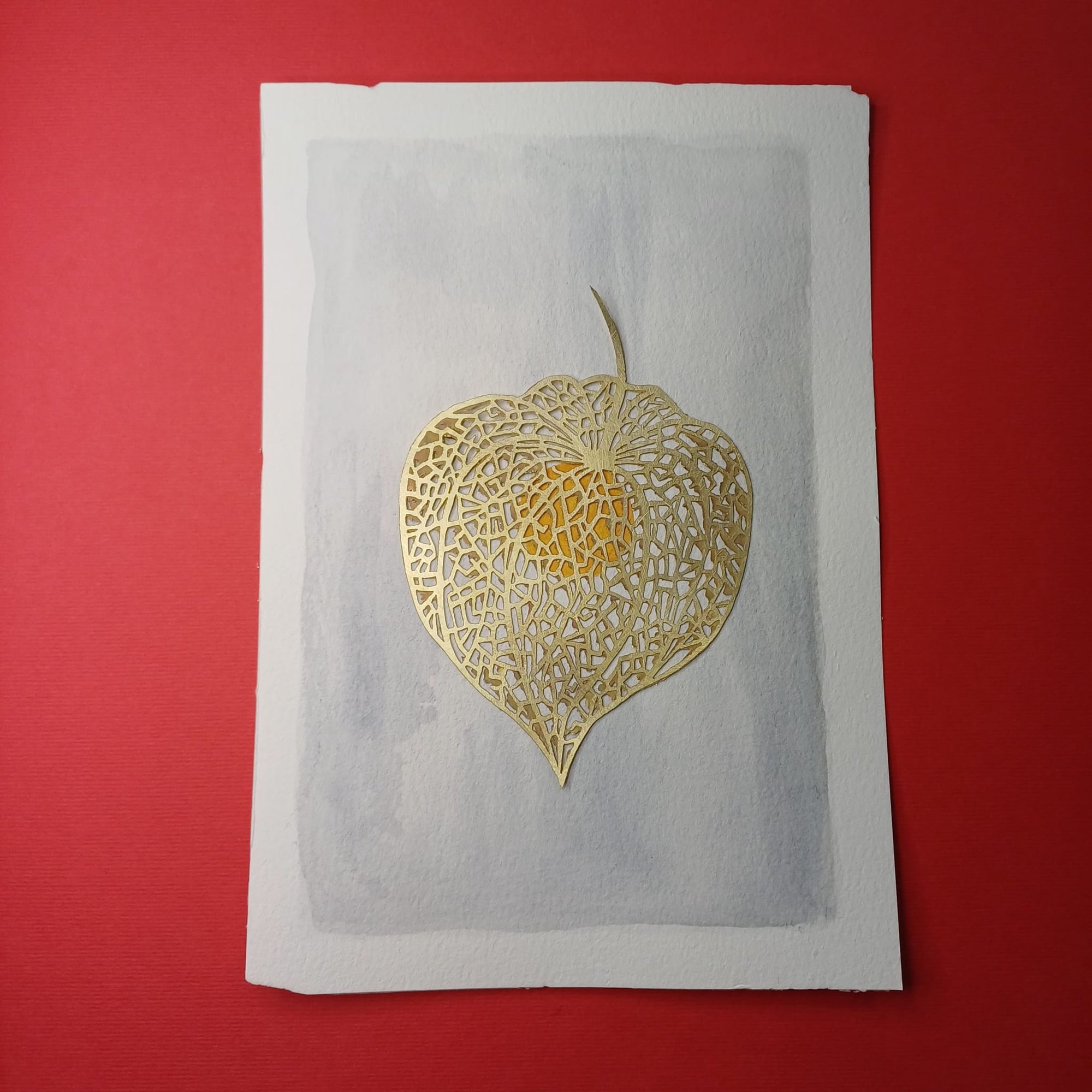 Engraved brass sheet 0.1mm brass etched foil applied to 200gsm 100% cotton paper (18x12,50cm), with Talens watercolour.